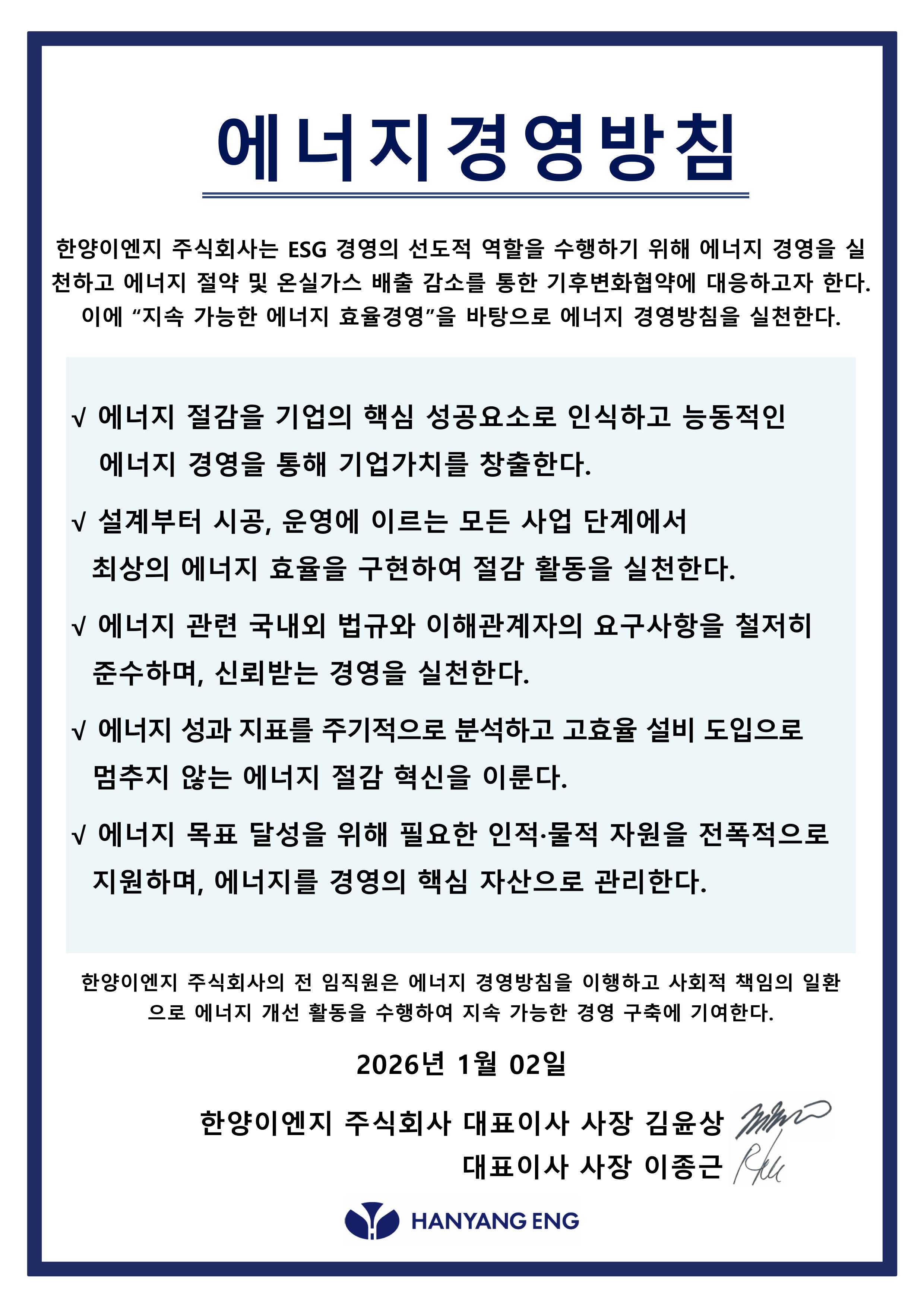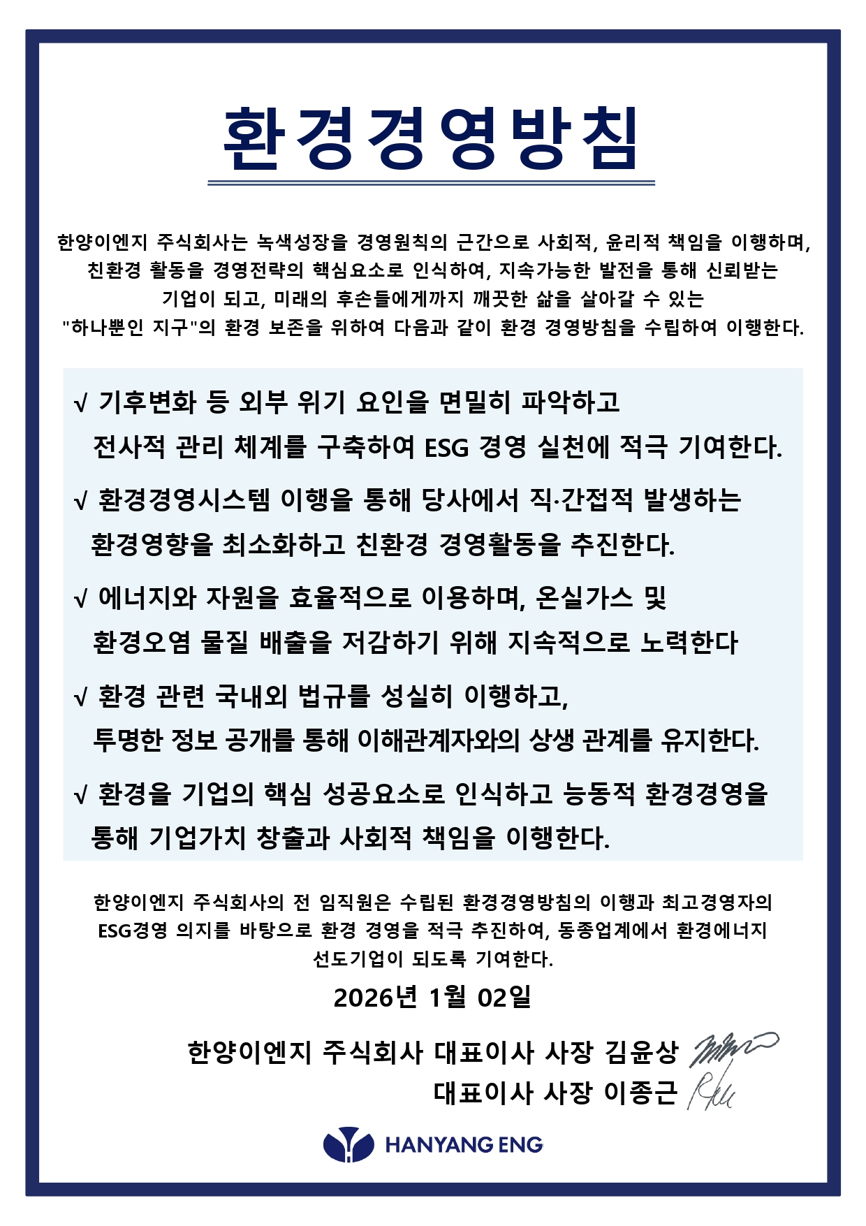 한양이엔지는 환경방침을 통한